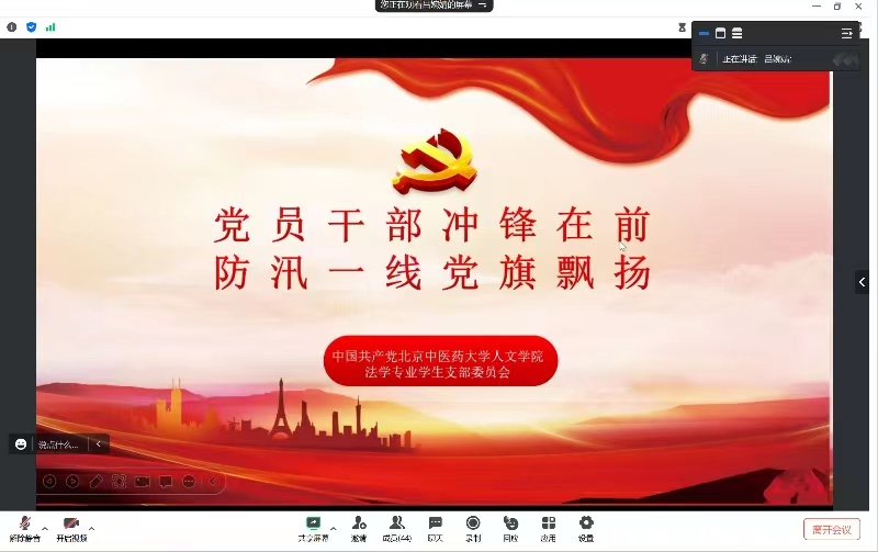 2023年8月13日下午3点,新葡的京集团8814法学专业学生支部与中国人民公安大学党支部通过腾讯会议的方式开展了以“抗洪精神”为主题的学习分享会。本次学习分享活动旨在学习过去"不怕困难、顽强拼搏"的抗洪精神,在当前洪灾形势下传承好这一宝贵的精神财富,并在日后的工作中学以致用,指导我们更好的为人民服务。活动由中国人民公安大学2022级法硕二区队党支部李无瑕同志主持,新葡的京集团8814法学专业学生支部与中国人民公安大学2022级法硕二区队党支部全体党员及部分入党积极分子参与活动。
