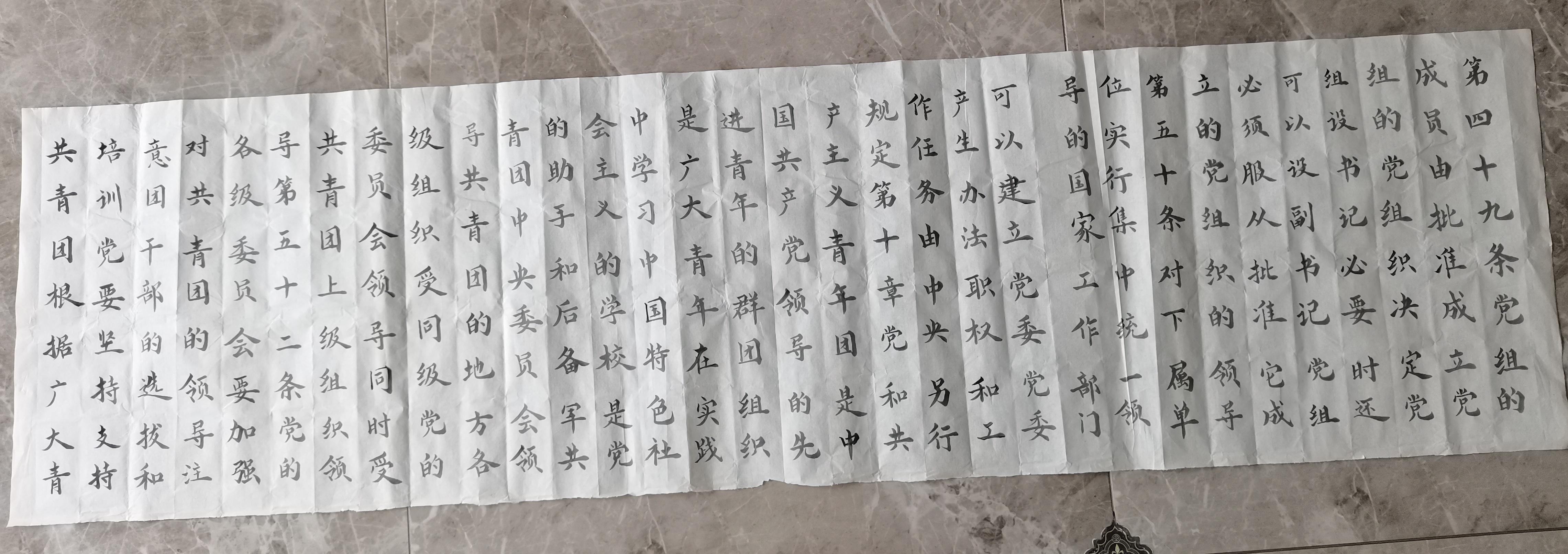 习近平总书记强调,学习党章是全体党员的基本功。党章是立党、治党、管党的总章程,集中体现了党的性质和宗旨、党的理论路线方针政策、党的重要主张,规定了党的重要制度和体制机制,是全党必须共同遵守的行为规范和根本准则。本次支部活动首先是“一笔一划”抄党章,即各位同志原原本本、一笔一划抄党章。平日里敲惯键盘、疏于动笔的党员纷纷拿起笔,工工整整地抄写党章。在抄写党章的过程中,各位党员充分发挥主观能动,用不同的方式认真书写党章,体会党章内容。