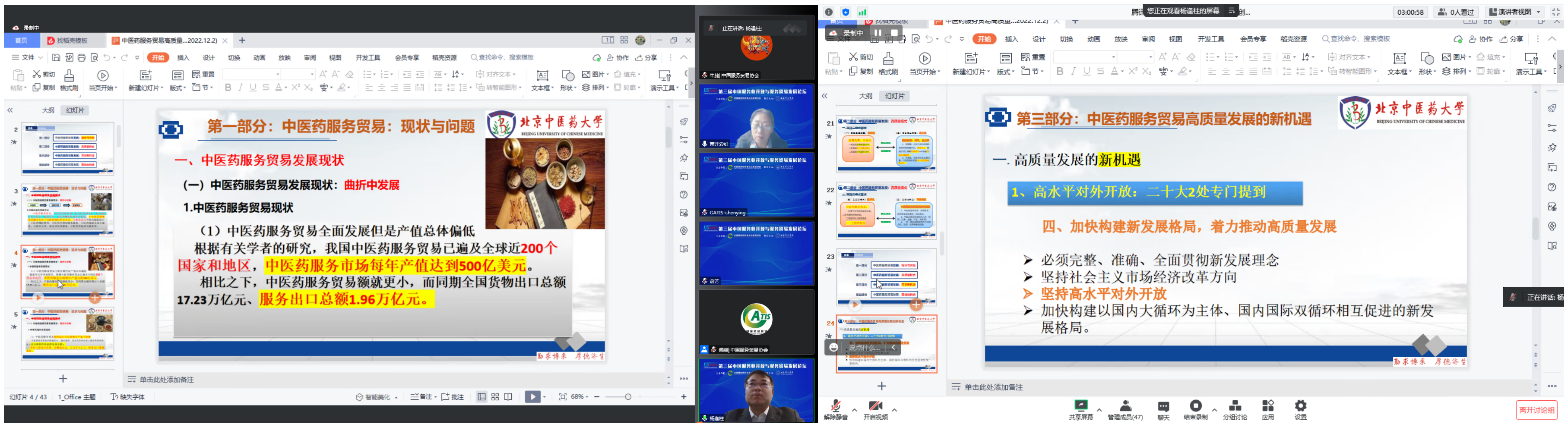 新葡的京官网法律系主任杨逢柱副教授以《中医药服务贸易高质量发展的机遇与挑战》为题做主题报告。报告从中医药服务贸易发展现状与问题、中医药服务贸易发展高质量要求、中医药服务贸易机遇与挑战等角度,总结了中医药服务贸易发展的历史成就,分析了中医药服务贸易发展存在的问题及原因,指出了中医药服务贸易高质量发展的特点和需求,明确了中医药服务贸易“市场化、本土化、数字化和系统化”等高质量发展的方向,剖析了中医药服务贸易发展的重大历史机遇——“高水平对外开放政策”和“数字化浪潮”,提出了破解中医药服务贸易高质量发展的国内法律和国际法律对策。本次报告引起与会专家的重视,并推动了对于中医药服务贸易高质量发展的深入思考。